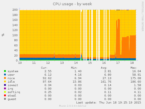Aber..da war doch was mit Strom? Natürlich frisst jede Hardware, wenn sie nicht im Leerlauf ist, mehr Strom. Ich habe der Berechnung selbst enge Grenzen gesetzt, was die Berechnungen angeht. So werden Berechnungen nur an 3 Tagen der Woche durchgeführt. Und auch dann gebe ich nicht 100 % der Ressourcen frei, um den Stromverbrauch (und Verschleiß) nicht gleich in astronomische Höhen zu treiben. Recht interessant: Trotz deutlich gestiegener Auslastung (rechts, ich bitte den beschädigten Graphen zu verzeihen, ich hatte ein Munin-Problem) geht die Temperatur nur mäßig hoch und bleibt unterhalb meiner „Wohlfühlgrenze“. Wie sich das Ganze auf den Stromverbrauch auswirkt, wird sich zeigen. Hierfür muss ich noch entsprechende Hardware anschaffen.