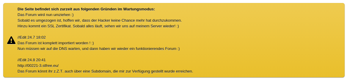Kein Kommentar notwendig Wie gings weiter? Inzwischen wird wild am Forum gebastelt. Inzwischen zog es auf den Server eines „befreundeten Security Profi“ um. Natürlich kenne ich ihn nicht, aber ich vertraue inzwischen keiner Aussage mehr des Admins mehr. Die Admins sind übrigens minderjährig. Was die Erziehungsberechtigten wohl dazu sagen. Das Fass möchte ich übrigens zulassen… Das Desaster Management erscheint mir selbst auch nicht wirklich durchdacht . Im Gegenteil, es macht einen chaotischen Eindruck. Die Tatsache, dass der eigentliche Hack durch grob fahrlässiges Handeln ermöglicht wurde und die Gegenmaßnahmen wahllos erscheinen (komplett neues System (WordPress), dann noch ein neues System (WBB) und dann komplett neues System auf neuem Server macht für mich wenig Sinn und erinnert mich doch eher an einen Haufen aufgescheuchte Hühner. Das Forum wurde gestern mit folgendem Hinweis in den Wartungsmodus gesetzt. Worte wie „hoffen wir“ möchte ich nach einem Hack nicht lesen. Das klingt nach „ich hab keinen Plan wie das passiert ist“. Punkt.