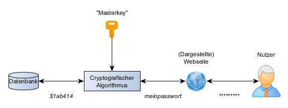 Grob gesagt legt der Browser das Passwort (hier „meinpasswort“) unter zuhilfename eines Cryptographischen Algorithmus (z. B. SHA256) in Form eines Hashs (im Beispiel z. B. $1ab414, stark stilisiert) ab.